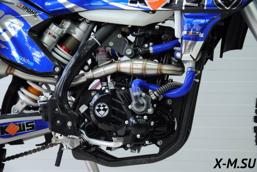Конструкция мотоцикла построена на прочной раме типа KTM 2017-2022 (K8), обеспечивающей идеальную развесовку и управляемость. Профессиональная подвеска с 48-мм вилками (аналог WP) и регулируемым моноамортизатором гарантирует комфорт даже на сложных трассах. Колеса с усиленными ободами UNISON 7075 и 4-мм спицами, дополненные тормозной системой уровня Brembo, обеспечивают полный контроль в любых условиях.