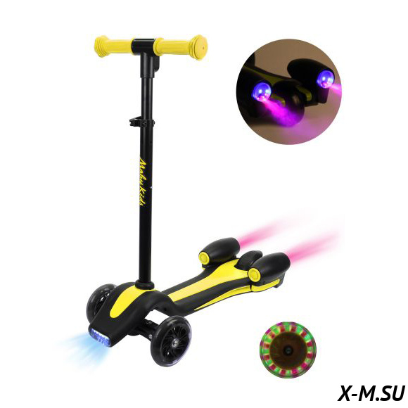 Хороший самокат для маленьких детей. Сын 3 года, ему нравится. Колёса светятся, звучит музыка. Руль регулируется под рост, но мне кажется, что он мог бы быть более устойчивым.